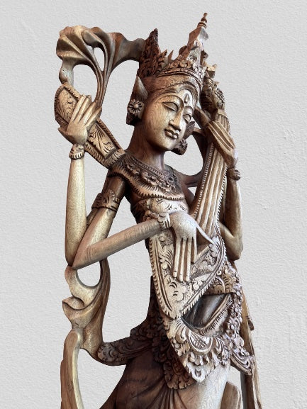- She has slender fingers and a stylized elongated form in a style typical of some Balinese sculpture, and she sits in a position of full of divine animated motion